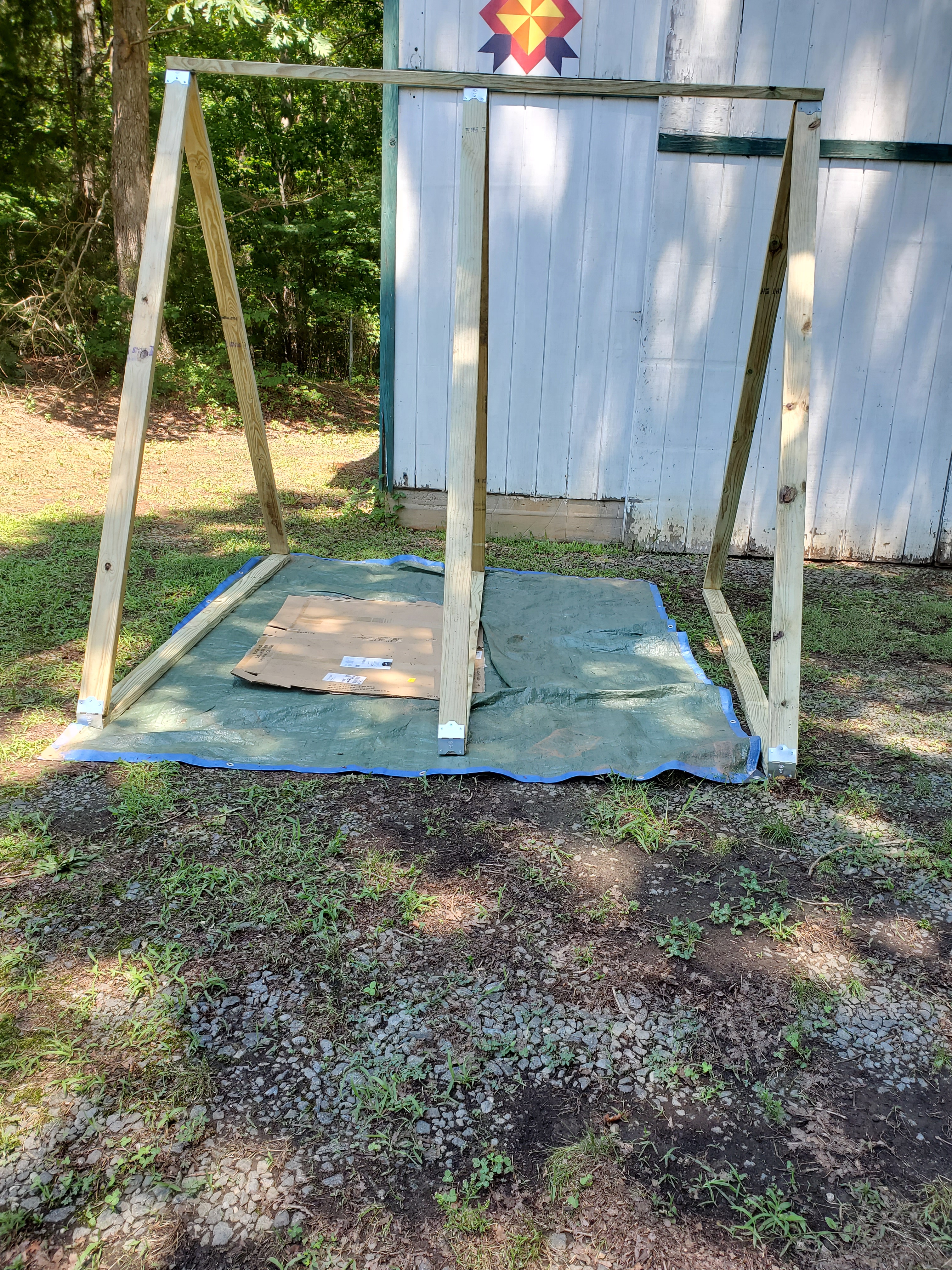 We added additional supports and soon realized this monstrosity was going to be two heavy to move from the driveway to it’s permanent place. As this was in the middle of lockdown (June) it wasn’t like we could call a bunch of friends over for a good ol’ Amish Barn Moving. So, we rolled it. It had to look funny …. lift, walk your hands down the edge, thunk. Repeat. Almost all the way to the other side of the property. I like to think God was entertained that evening.