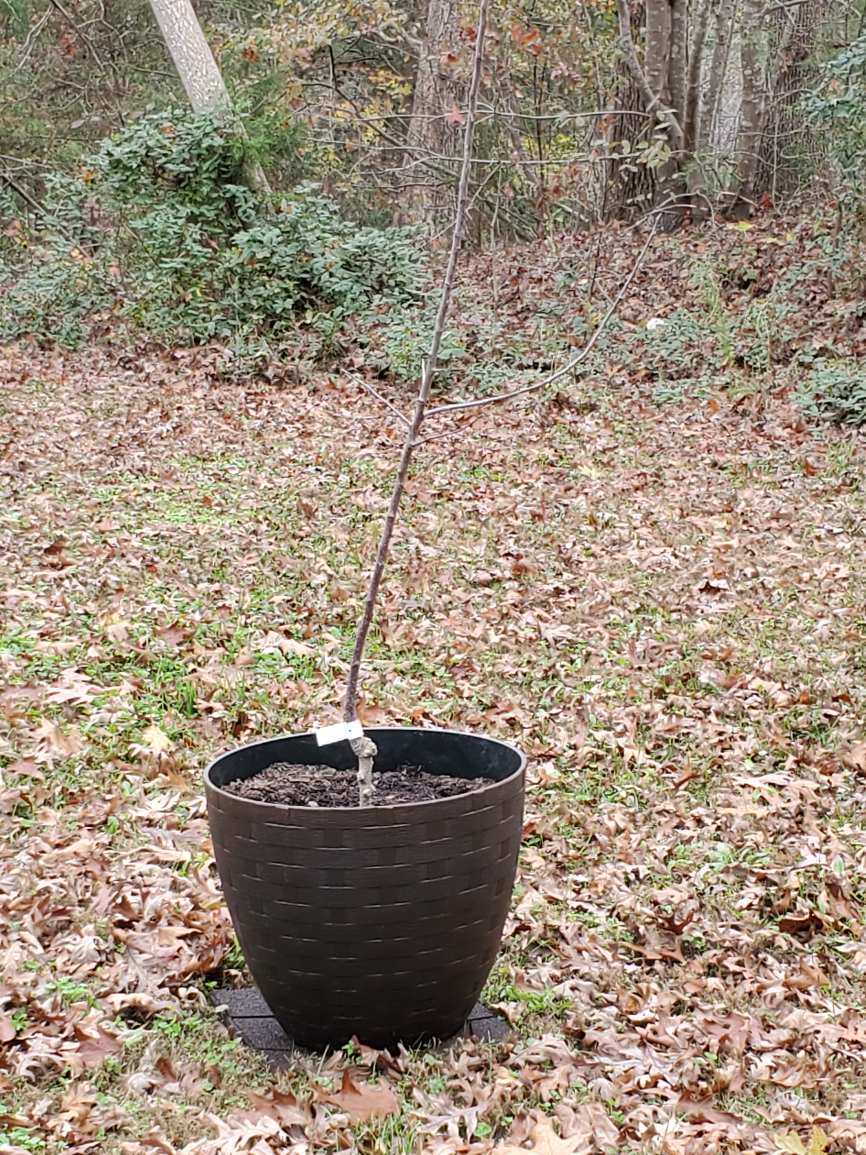 When the trees arrived, everything was ready to go. They got planted in their pots and placed in what seems to be the right areas of the yard. If not, I put a rubber mat (with built-in drainage channels) under each pot to keep them off the ground and make them more moveable.
