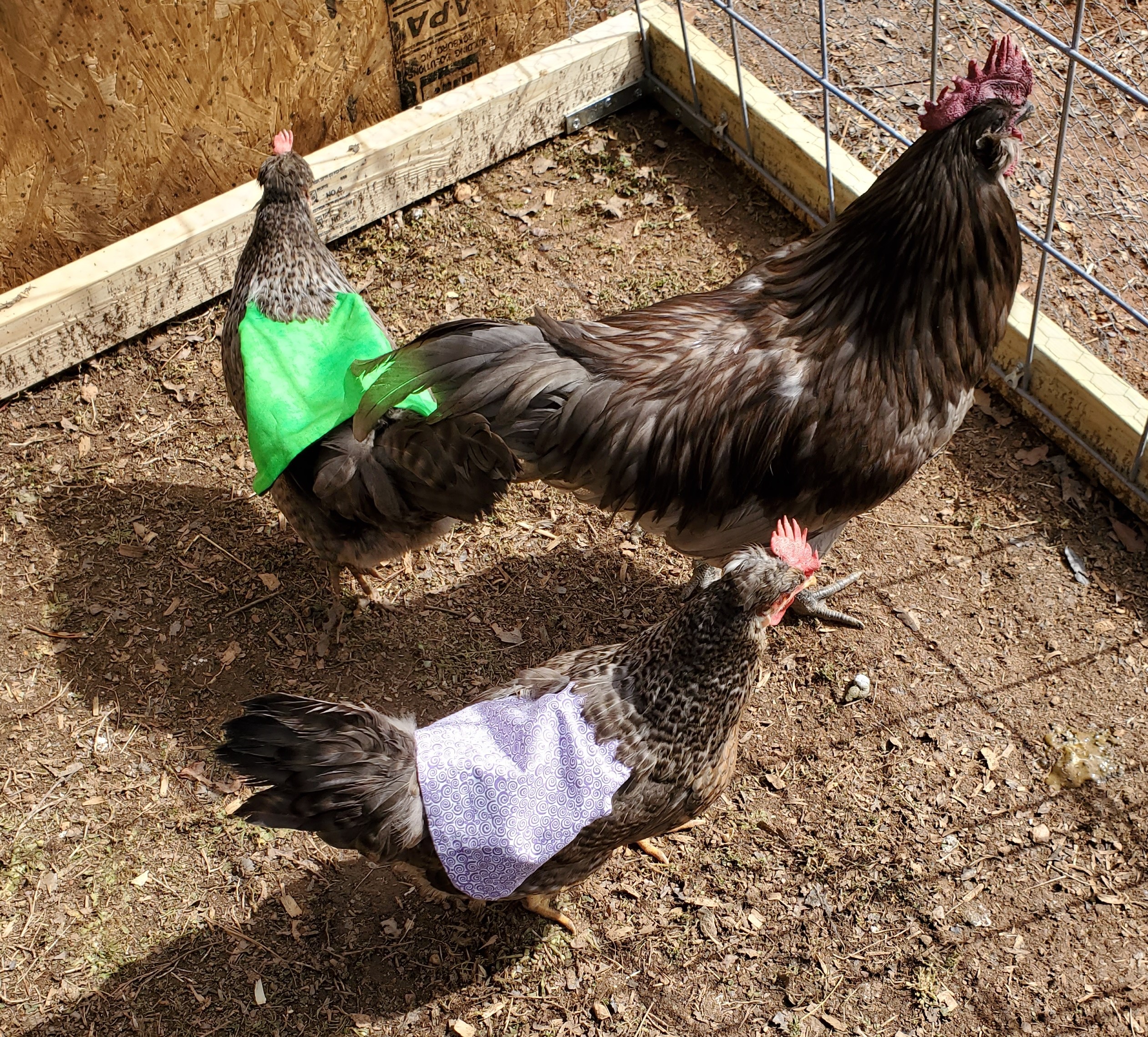 Road Runner, the nice rooster we kept, has been riding the hens too hard so we got them some chicken saddles.