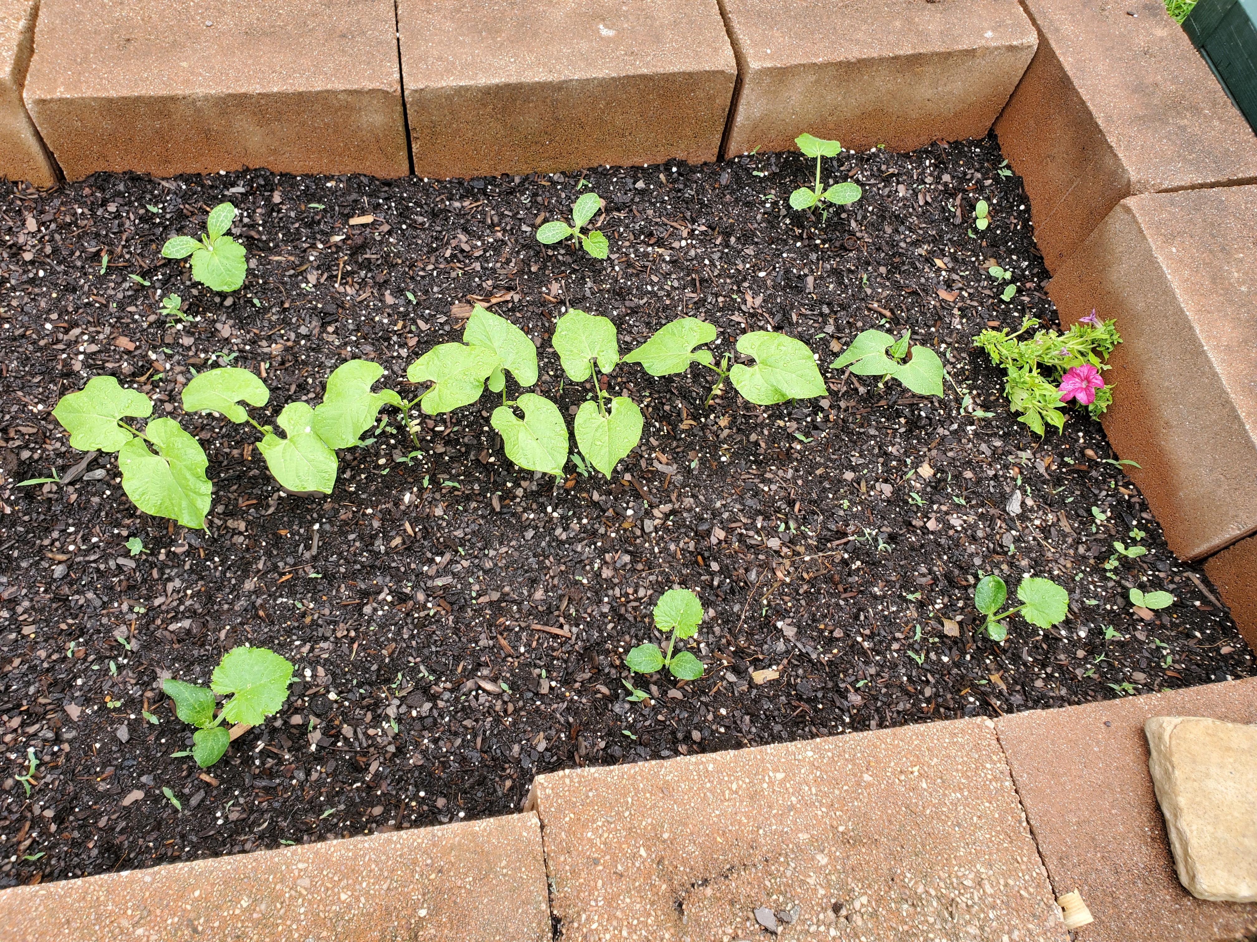 The beans and squash have been growing like crazy. The borage and nasturtiums have started showing above ground too. After only a week, this is what the bed looks like: