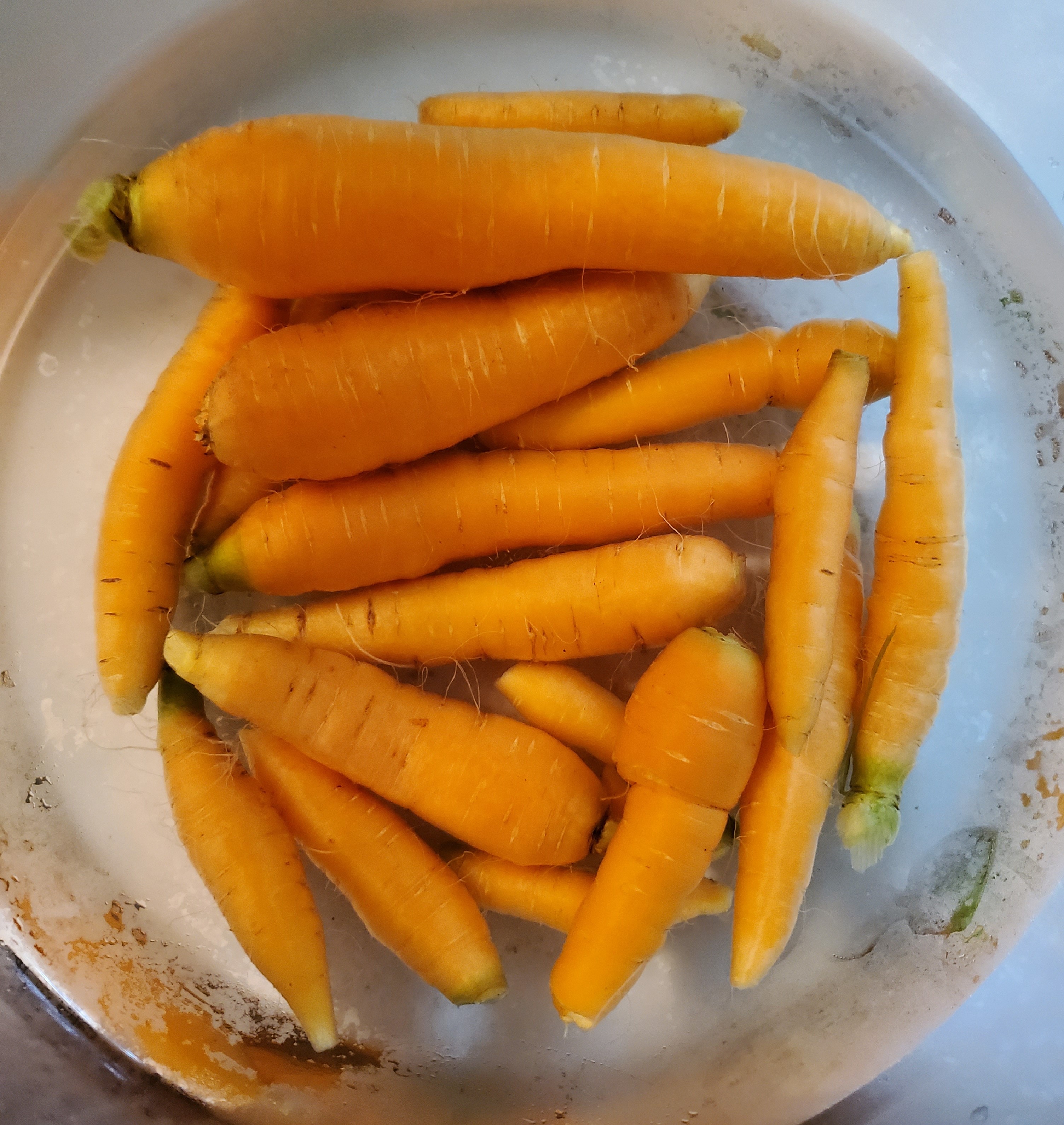 I cleaned out the last of the carrots and a few more peas from the other half of the raised bed. Minus the six or eight used in tonight’s dinner, this is what my final harvest of the spring garden produced: