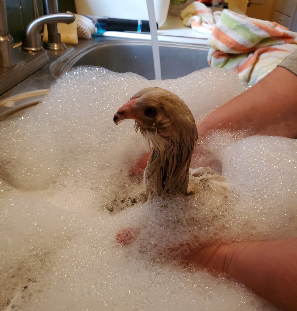 With the addition of the muddy mess created in the chicken run by recent rains, Chrissy looked totally manky and was in desperate need of a bath. So, she had her very first spa day!