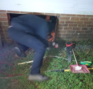Now, if you don’t know, under the house is where all the creepy crawlies live. ShUddEr. Oscar is just as creeped out by walking through spider webs and having bugs crawling on him as the next person, so this was not a place he would normally visit. Nevertheless, after sitting for a full five minutes in front of that hole going under the house saying “I don’t want to go in there,” he took a deep breath and did it!