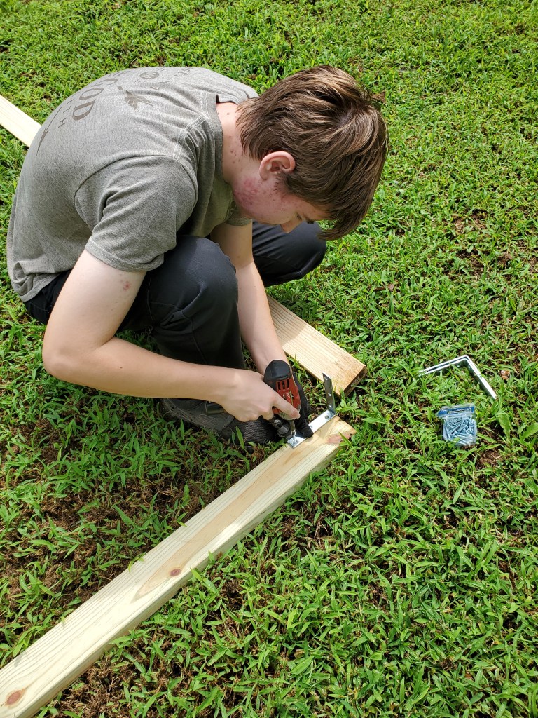 Monday, while Oscar was also off from work, we got the frame and hoops together for the 8′ x 12′ hoop house greenhouse. We placed it over the galvanized steel raised bed we had put together and filled with soil a couple of weeks beforehand.