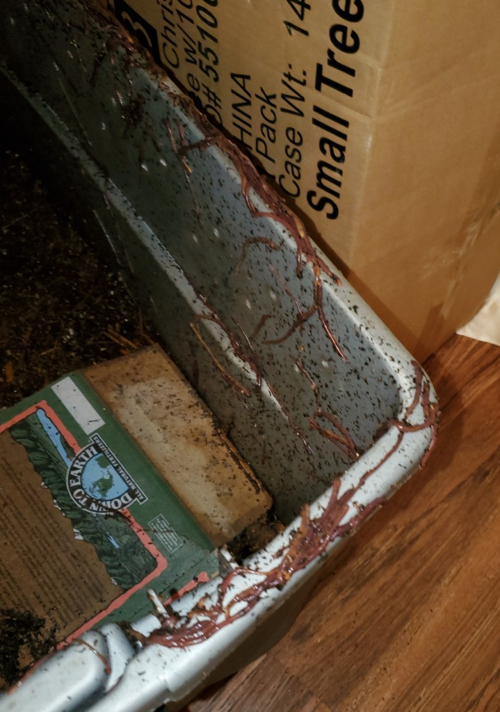 The meter showed that the bin was on the high end of moist, but not wet. Nothing else was wrong / missing so, apparently, that was just too much, and they didn’t like it. There were too many squishy worm bodies than what I could handle bare-handed (shudder), so I got a glove and picked every one of them off and put them back on the dirt. Then, for a couple of hours, I left the lid off to help dry the area a bit while leaving the overhead light turned on so they wouldn’t climb out (they don’t like the light). The next evening, they were still climbing so I did the same thing. By Wednesday, they were apparently happy again as there was no one climbing the walls. They’ve been fine ever since.