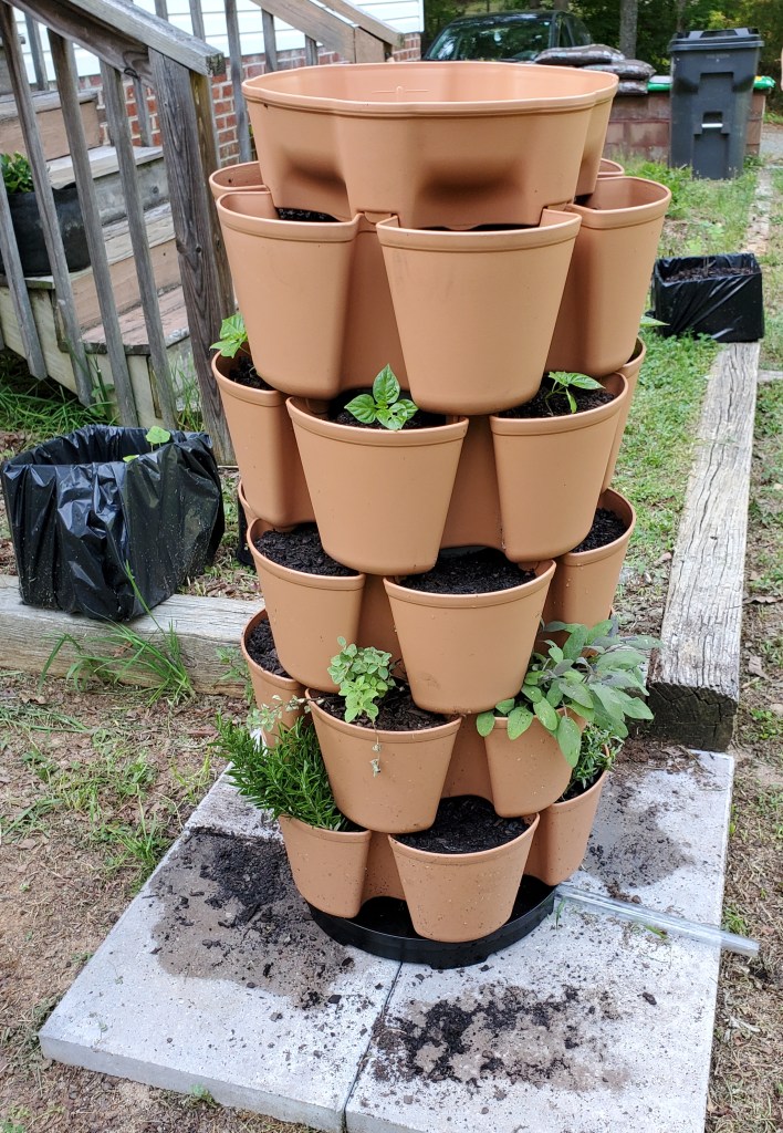 I had transplanted some tarragon, oregano, sage, thyme, and marjoram into my new “Leaf” Greenstalk planter on Monday. This weekend I transplanted rosemary into a couple of pockets. I direct-seeded the entire top level with nasturtiums as pest deterrent and, of course, because they are pretty. Lastly, I direct-seeded the remaining pockets with some borage, spearmint, and basil. This Greenstalk is now fully planted!