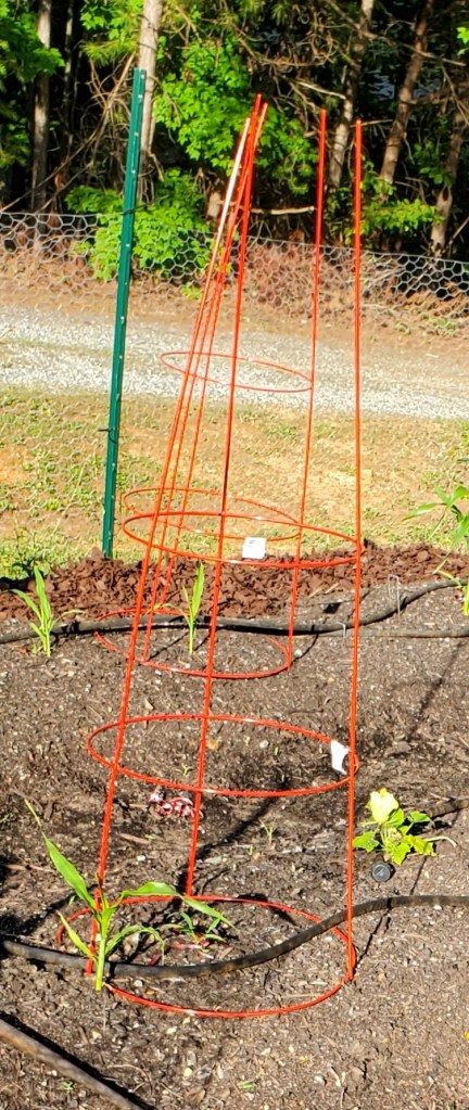 The corn hasn’t made much progress, but I was running out of time to plant the green beans. So, I got several tomato cages, turned them upside down, and planted the beans around them. My Three Sisters Garden is definitely not what you see in the pictures, but it has all the components.
