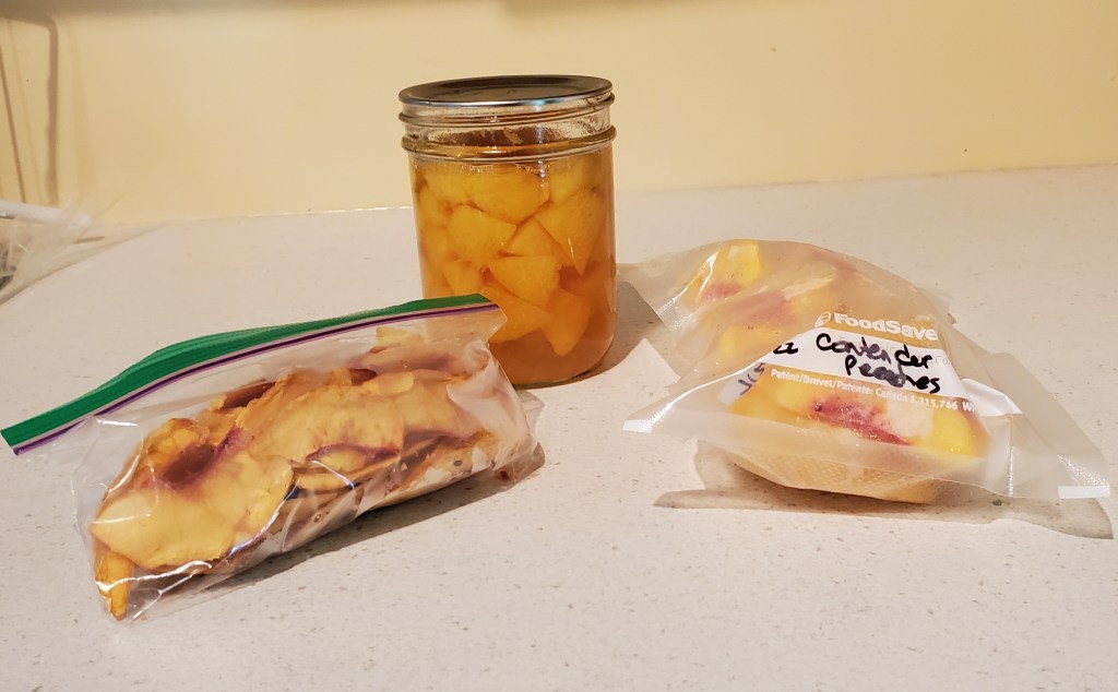 The frozen peaches were sliced and have been vacuum-packed. This will extend their life two or more years. The nice thing about these is that I can thaw and use them to make yummy peach treats, or, I can decide to make them into something else that I did not want to fuss with just now – jam, syrup, pie filling. I can even dehydrate them later.