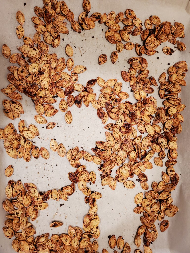 Roasted pumpkin seeds are an inexpensive, nutritious and easy-to-make snack. Pumpkin seeds have been shown to improve heart health, blood sugar levels, sleep quality and may even protect against certain types of cancer. They are a great source of protein, fiber, Vitamins A, K and E, riboflavin, folate, potassium, magnesium, iron, zinc and many more nutrients. The antioxidants in pumpkin seeds reduce inflammation and protect your cells from free radicals and many diseases.