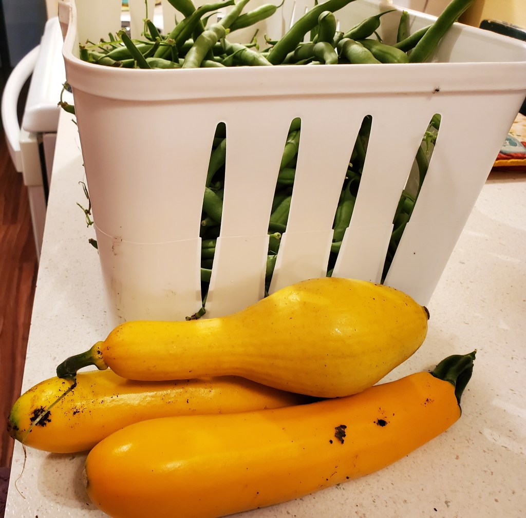 I picked almost a full basket of green beans, two zucchini, and one crookneck squash.