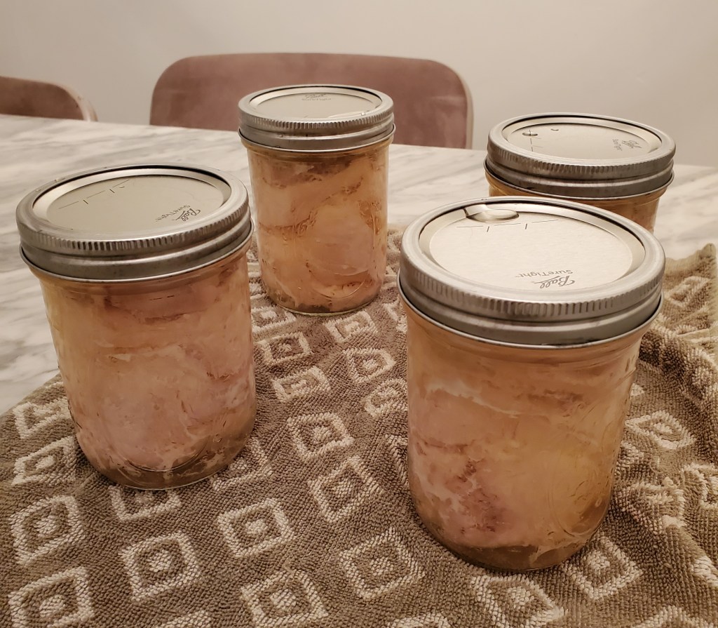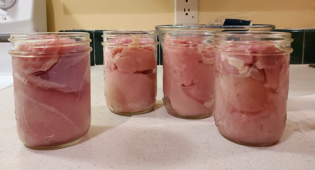 With so little effort, I have shelf stable meat to use in any recipe that calls for cooked chicken. Each pint jar holds about a pound of chicken (a quart holds two pounds).