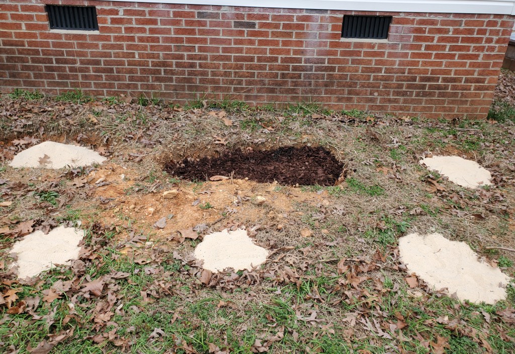 We also put a fresh layer of bedding in the chicken coop, bought concrete blocks for an upcoming project, bought five bags of sand to put in the holes left when the azaleas were removed from in front of my house, and bought a few t-posts we are going to need to fence in the expanded in-ground garden. We even dumped the sand and a leftover bag of mulch in the holes. We’ll have to get more before covering the area with landscape material, but at least I won’t trip in the holes anymore.