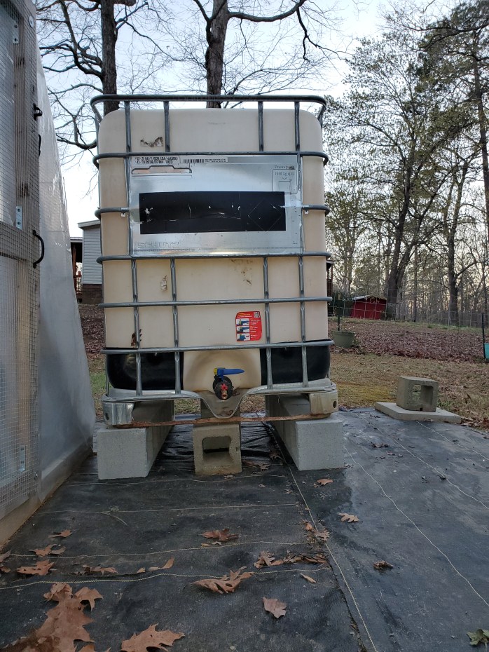 Jessica and I laid a new area of landscaping cloth in front of the greenhouse and set out some concrete blocks I had purchased a few weeks ago. Then, the five of us shifted the IBC tote to those blocks.