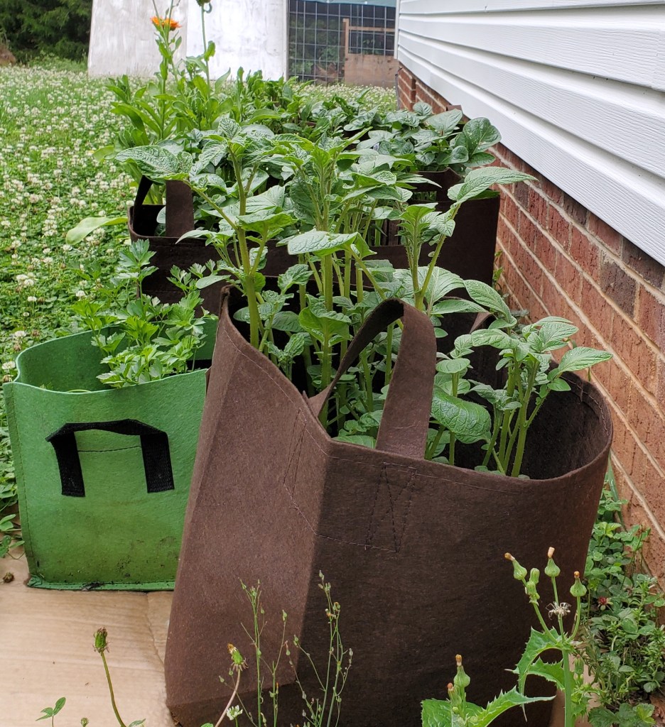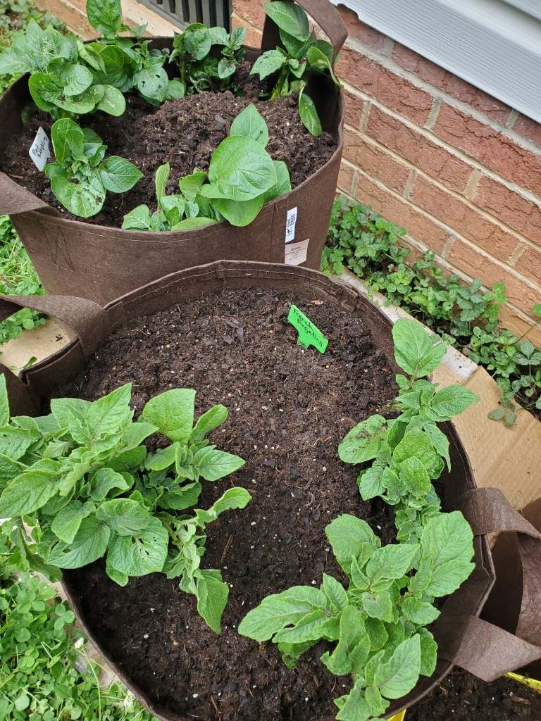 Following the process for planting potatoes in pots, I put 3 inches of soil in the bottom of each pot, added the seed potatoes, and covered them with dirt. After the leaves sprout and grow to about 3-4 inches high, the foliage gets covered with more dirt, leaving about an inch of greenery. Let it grow again until the exposed plant is 3-4 inches high and add more dirt. Repeat, repeat, until the pot is full. Each addition of soil encourages more root growth, resulting at the end with more potatoes.