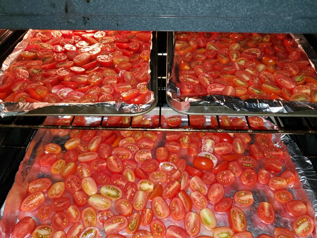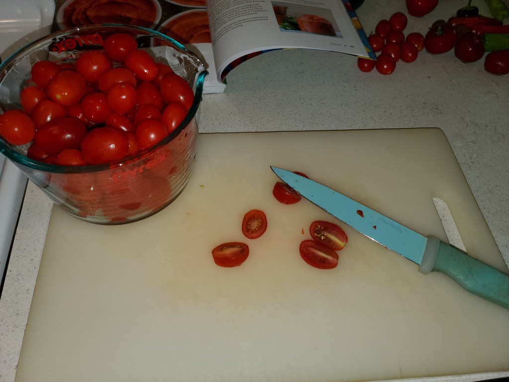In the week since my return to the homestead, I harvested more than the 12 cups of cherry tomatoes needed for the recipe. The refrigerator was overflowing with them!