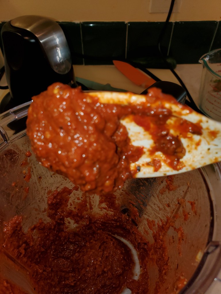 The next step was to put the roasted tomatoes in the blender, add the seasonings, and run it until it’s smooth. Just look at how thick this sauce is: