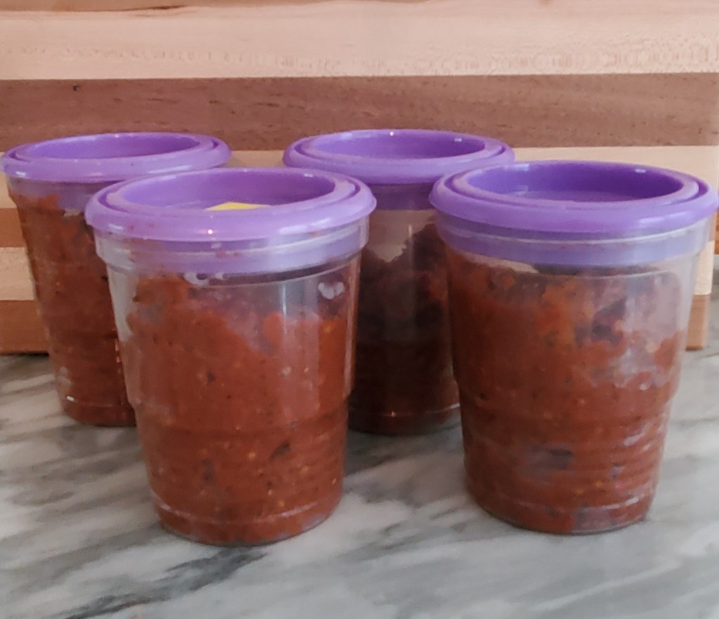 I got four and a half cups of sauce in the freezer. One cup is enough for two 10-inch pizzas.