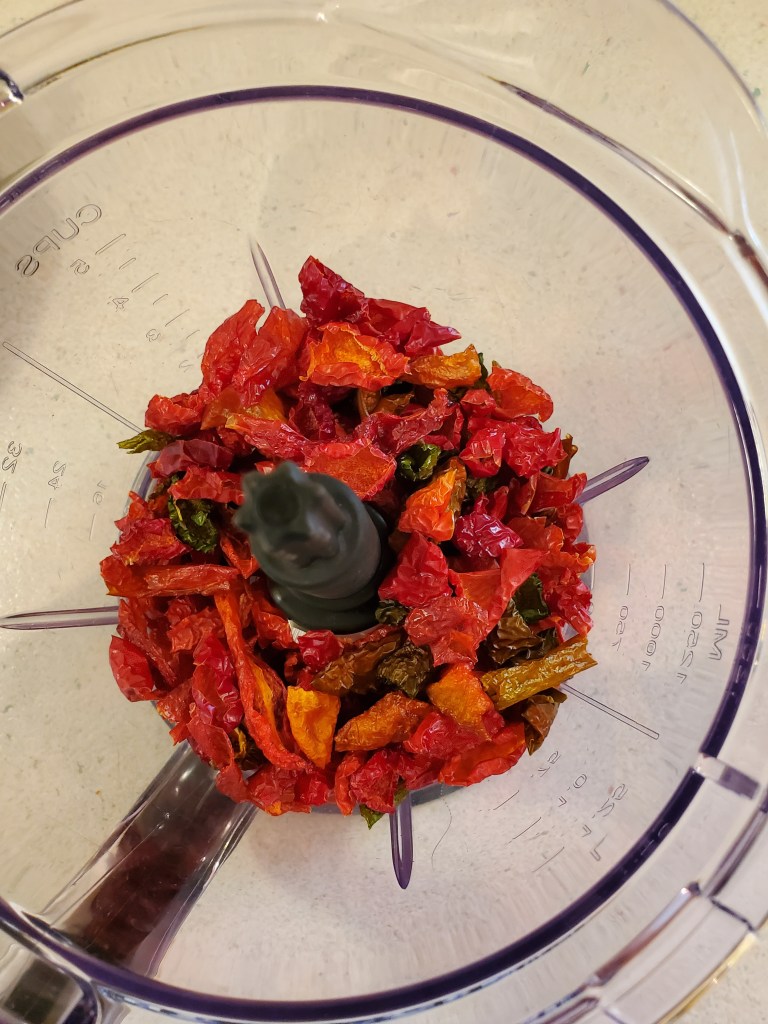 Once, dehydrated, I put the peppers in a quart jar that I vacuum sealed. They stayed there while I decided what I wanted to do with them.