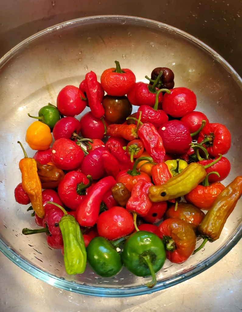 As the season progressed, I just kept collecting piles and piles of peppers in a bowl in the fridge. Then in another bowl. And another. I collected not just the Time Bombs but also some pepperoncini (which I had high hopes of pickling but gave up on that idea early on), and whatever else made it in there.