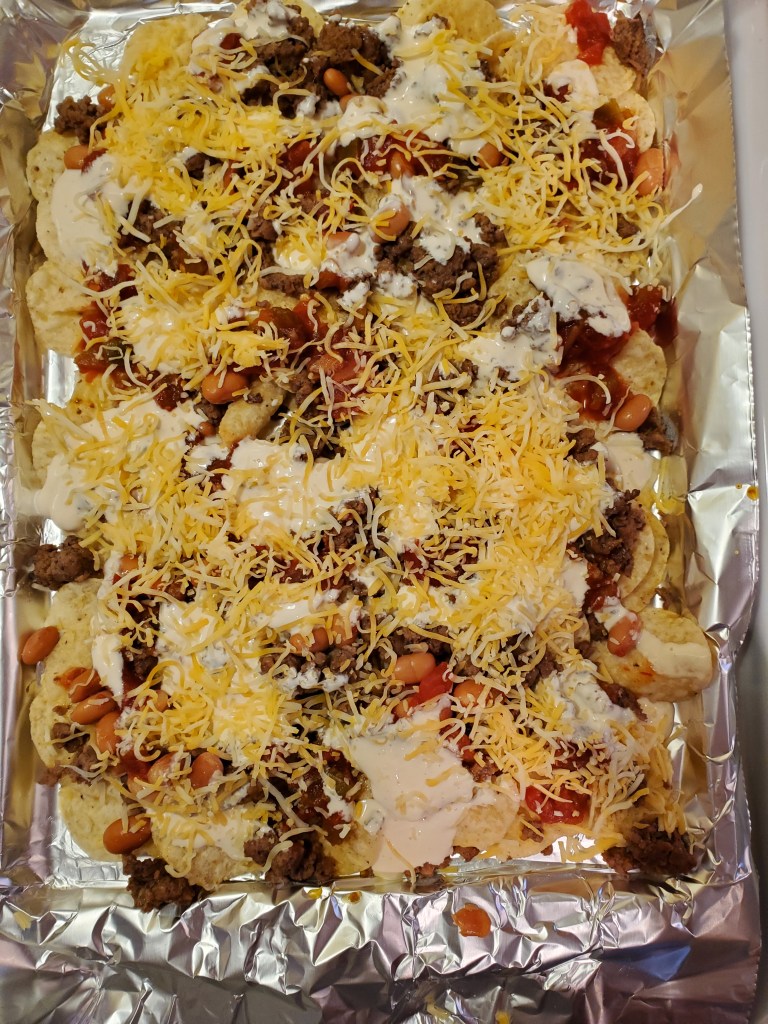 By this time, we were both starving as we hadn’t eaten lunch, and it was three o’clock, so I came inside the house and made Sheet Pan Nachos. Yum! Yum!