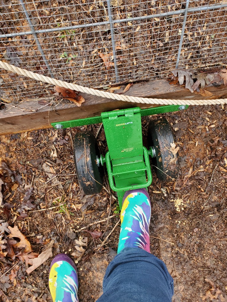 I knew about the ChickLift when I made plans to build the Chicken Tractor but was not willing to pay the price to buy one. However, when I compared what I would have to spend to re-create the original wheels (not counting the anguish involved with getting them built and installed), suddenly the price tag didn’t seem so bad.