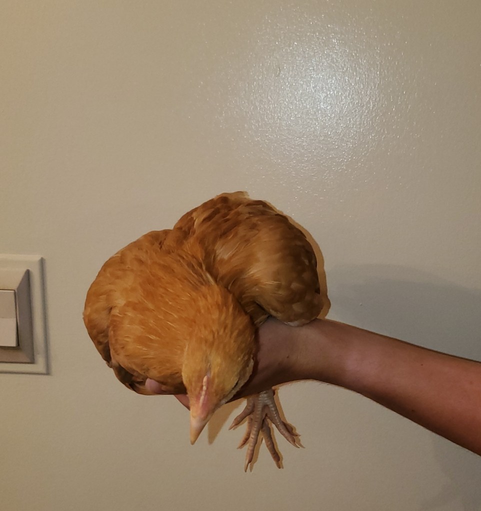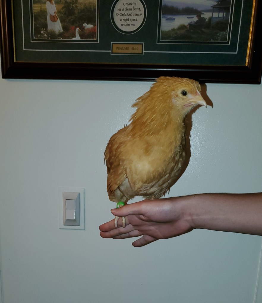 The Orpingtons do not have names yet. Each wears a different colored leg bands so that we can tell them apart though so that will help with naming them, eventually. Don’t let the one on the left fool you – she’s acting all shy for her picture, but she is the one that will take every opportunity to escape!