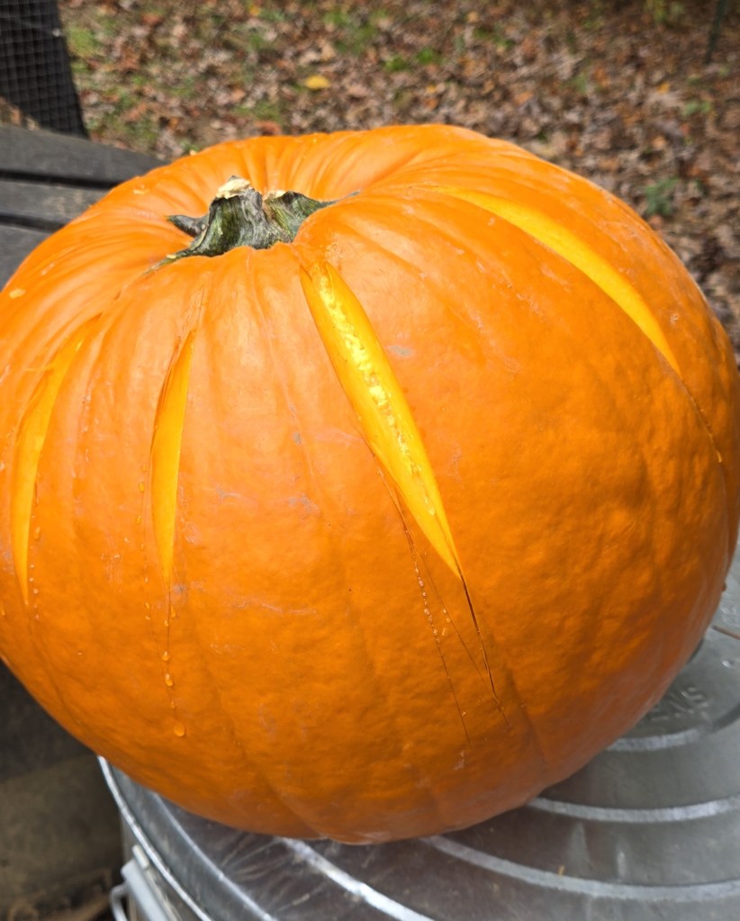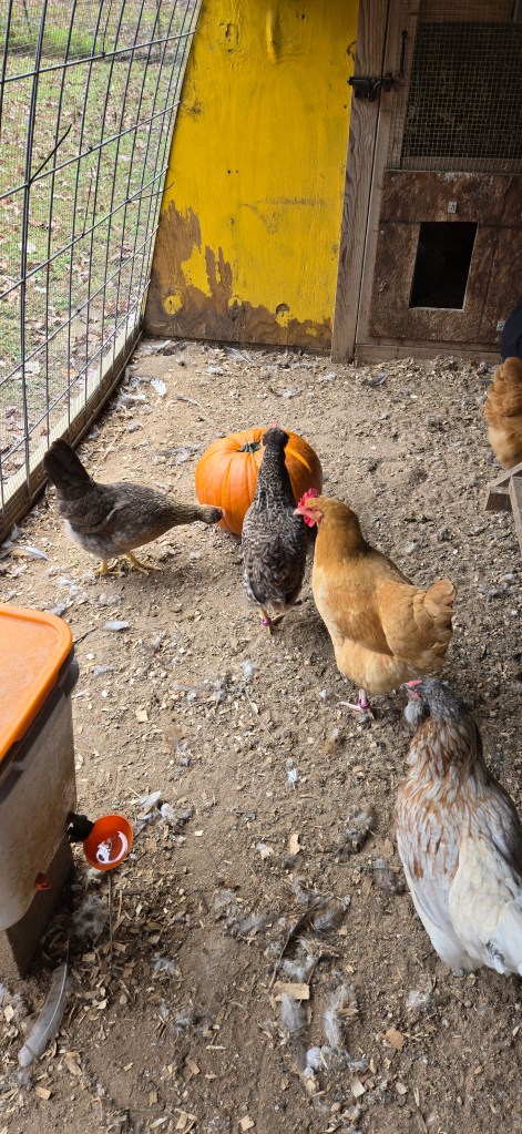 TREAT: With Halloween done, the cost of pumpkins has gone down so I got one for the chickens. I got a nice sized pumpkin for just $2.99. Chickens love pumpkins and pumpkins are good for chickens (click the link to find out how) so they will appreciate the treat.