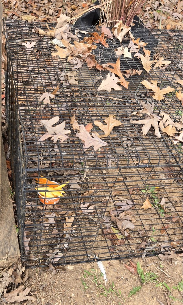 TRICK: A cage for Calvin. Calvin still runs from us, but I’ve started to leave him food, hoping to gain his trust.