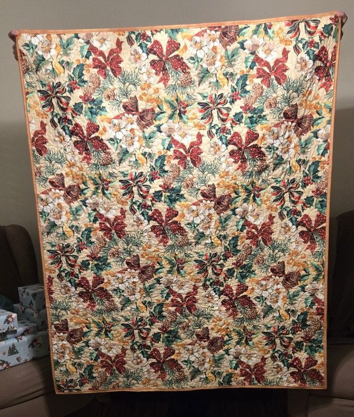 I have a good friend at work and I decided that if I finish only one quilt, it would be hers. I used a kit to make a Christmas quilt top and applied the things I learned in my Free Motion Quilting class to complete it.