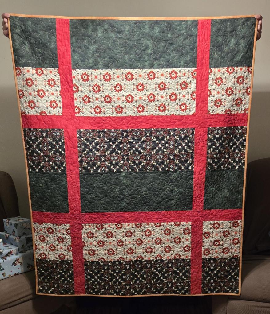 As has been the case all year, what should have been a very simple project was fraught with frustrations. First, I mis-cut one of the fabrics and because the kit gave barely enough material for the project, I had to sacrifice one of the borders. I had to order more material for the binding but it was the wrong shade of red and was unusable for this project. I ended up using some material dedicated to a different project to bind this quilt. I broke 5 needles in the course of this one project. When I was doing the quilting, the thread kept breaking. The alternate name for this quilt became “Blood, Swear, and Prayers” because that is exactly what was involved in getting it done!
