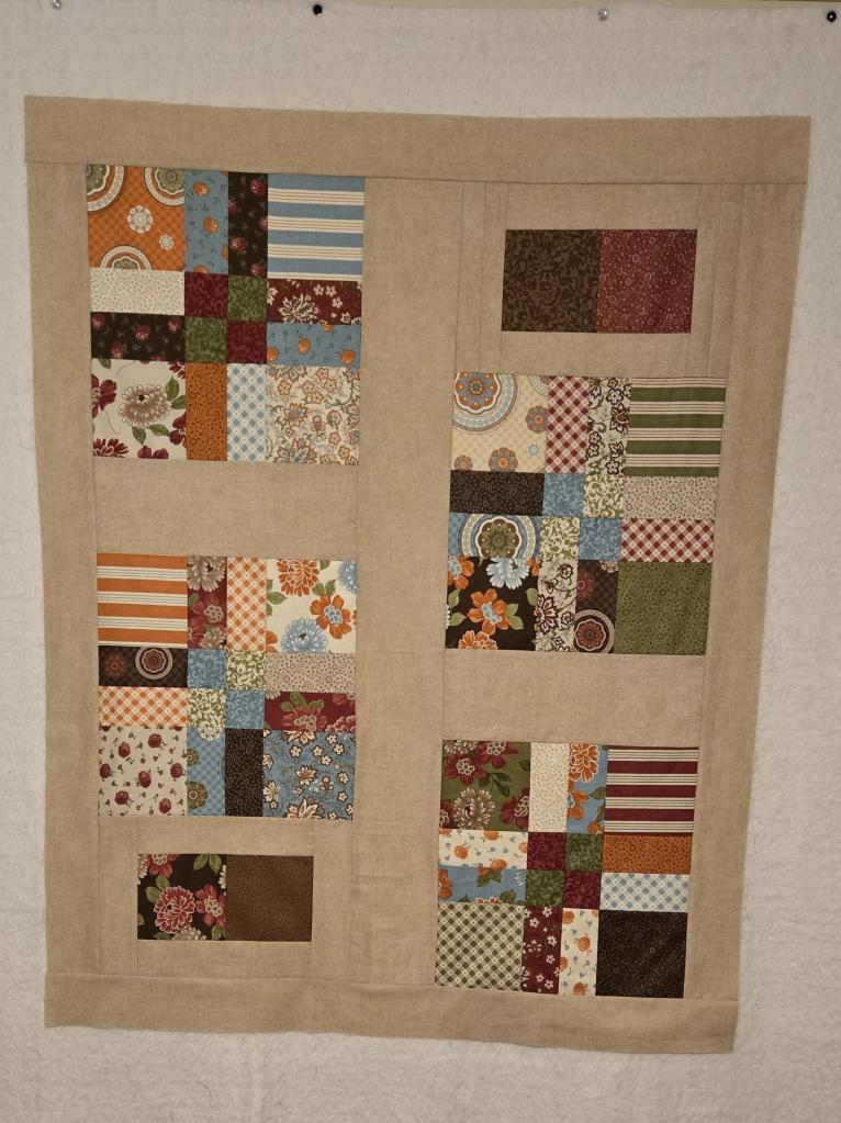 I named it “Plot Twist” because I kept having to revise my plans. First, I was just going to make straight-forward Nine-Patch blocks with sashing but since I had just something similar, I did a Disappearing Nine-Patch instead. I was going to do the four blocks in the staggered formation shown with a lot of blank space, but my quilt math was off, and I didn’t have enough of the tan material to do that. So, I adapted by adding the two-patch squares made from left overs from the charm pack). Even then, I had to piece the tan sashing around the upper right two-patch. When I say there were no scraps left, I mean None! When completed, this will make a nice lap or wheelchair quilt.