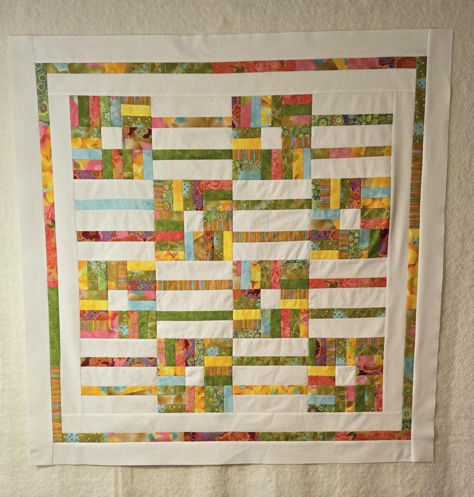 This one is named “Swizzle Twist.” The material was purchased and cut back in 2009. I want to finish this one with yellow fabric for the back and binding. This will be a cute baby quilt when it’s done.