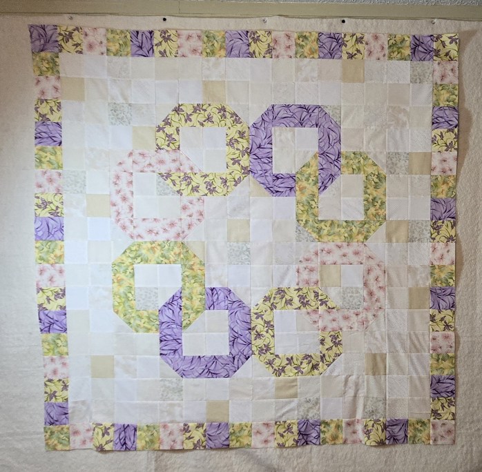 I also was able to meet my goal of finishing another quilt top this month. I’ve had the material (Janet Rose) since 2009 so, besides being able to work through more of my fabric stash, I now have this beautiful quilt top. The pattern is “Wedding Rings.”