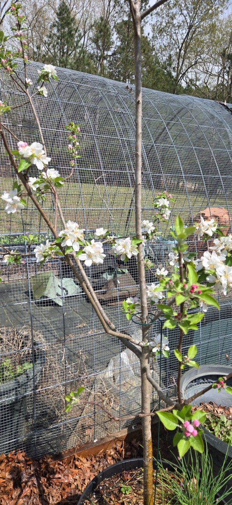 We got the apple trees netted so, hopefully, that will prevent the birds from scarfing up my apples. Cross your fingers.