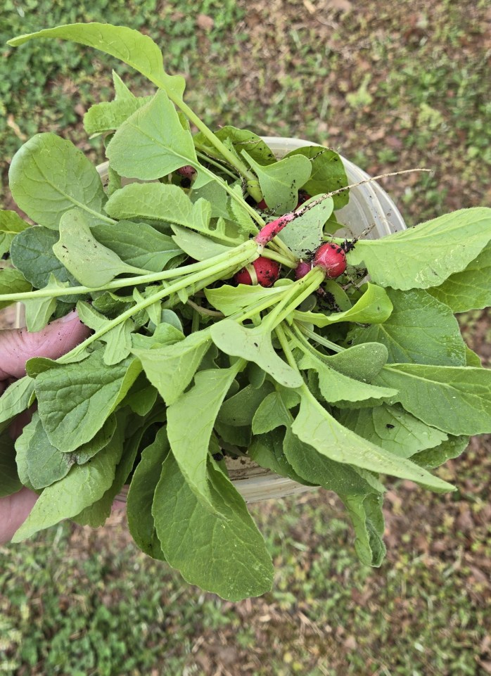 When I planted my greens beds, I mixed radish seeds in with the other seeds. I have used radishes as “spacers” in the garden for decades. That way, instead of measuring how far to space the different seeds out, the spacing is created as the radishes are harvested.