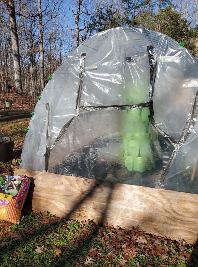 Today, the winds were bad again and the back end came apart so we pulled out that homesteader’s staple: duct tape. We taped all the plastic sheeting pieces and seams together, put the board back against it, weighted the board with leftover bags of soil.