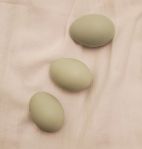 They are little pullet eggs, which are about the size of the medium eggs you see in the grocery store. The color is leaning toward sage green now but that could change to more of a blue as time goes on. Or, they might stay green – I did get some Easter Eggers after all.