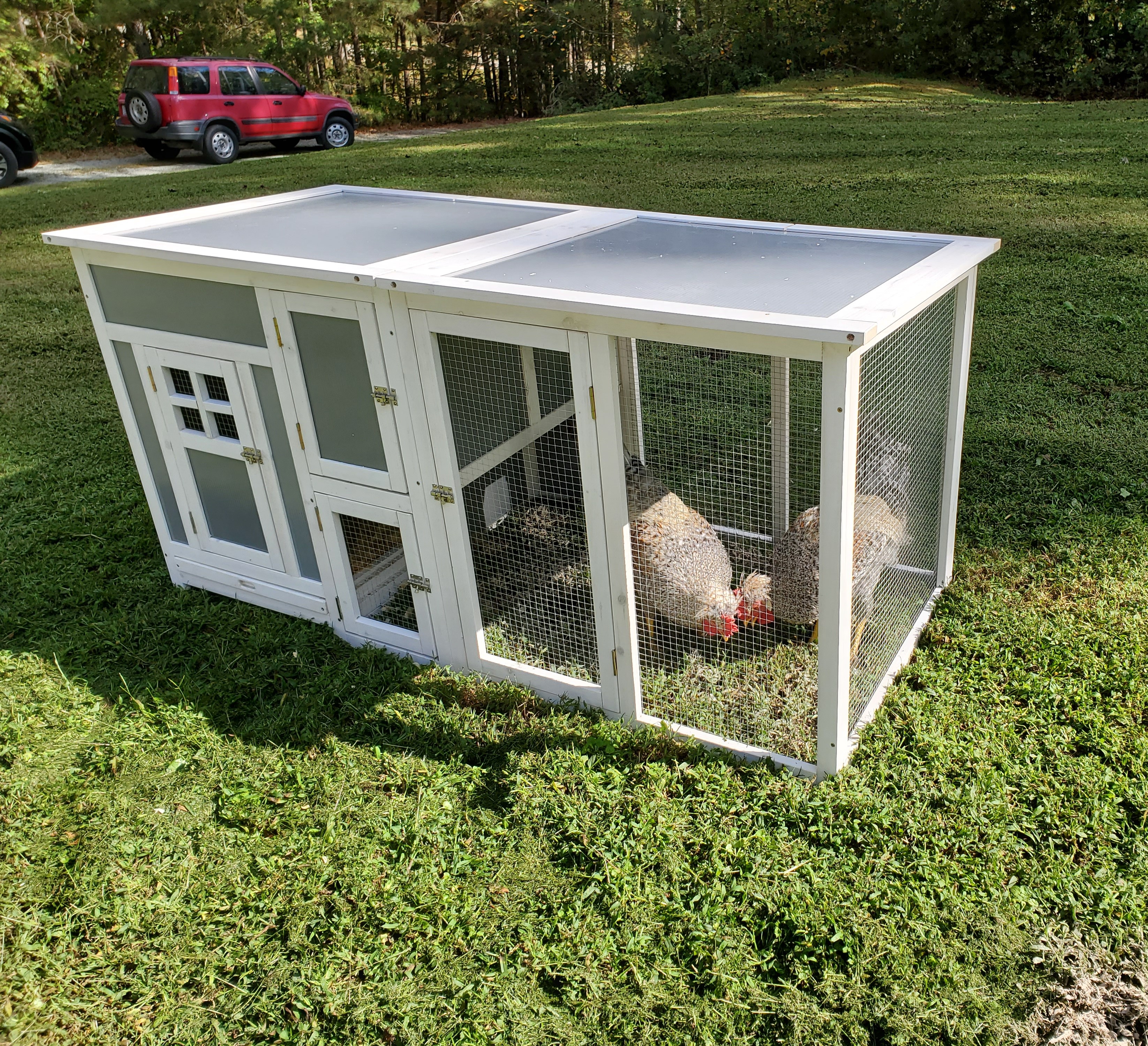 We put it in the front yard. The main coop is in the back yard. When the two groups could see each other, they wanted to be together. I think it will be easier on both groups if they don’t see each other. We’ll see if that bit of chicken psychology plays out. It’s Fall so the front yard is not blistering hot like it is in Summer so they can stay there probably until May. Another thing I like about this set-up is it’s light enough that we can easily move it as they need fresh grass. At any rate, they love their new coop!