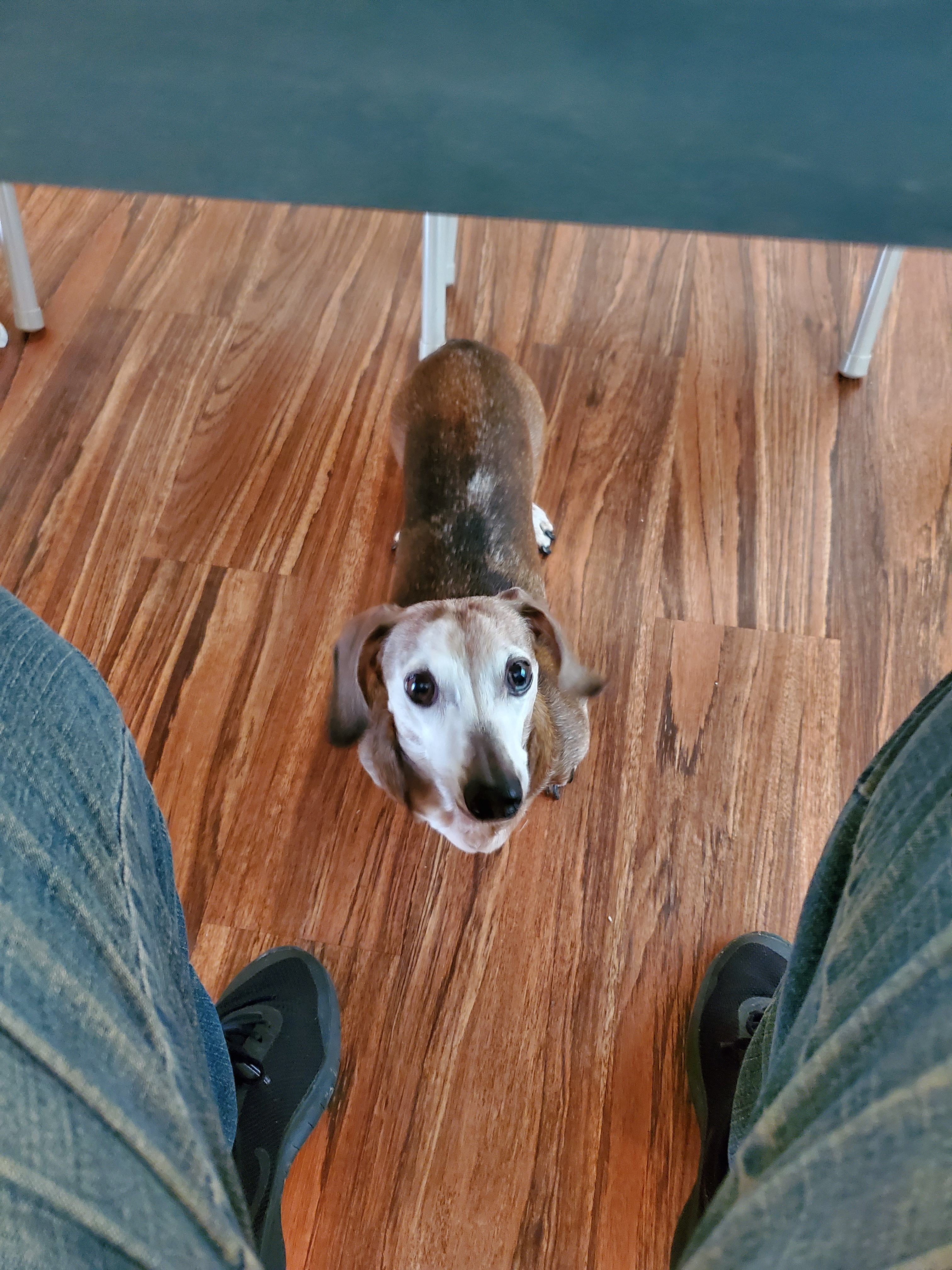 Timmy is always underfoot when food is being prepared, waiting for a “fumbled” bit to lick off the floor. He is very efficient but complains if I’m not being “clumsy” enough.