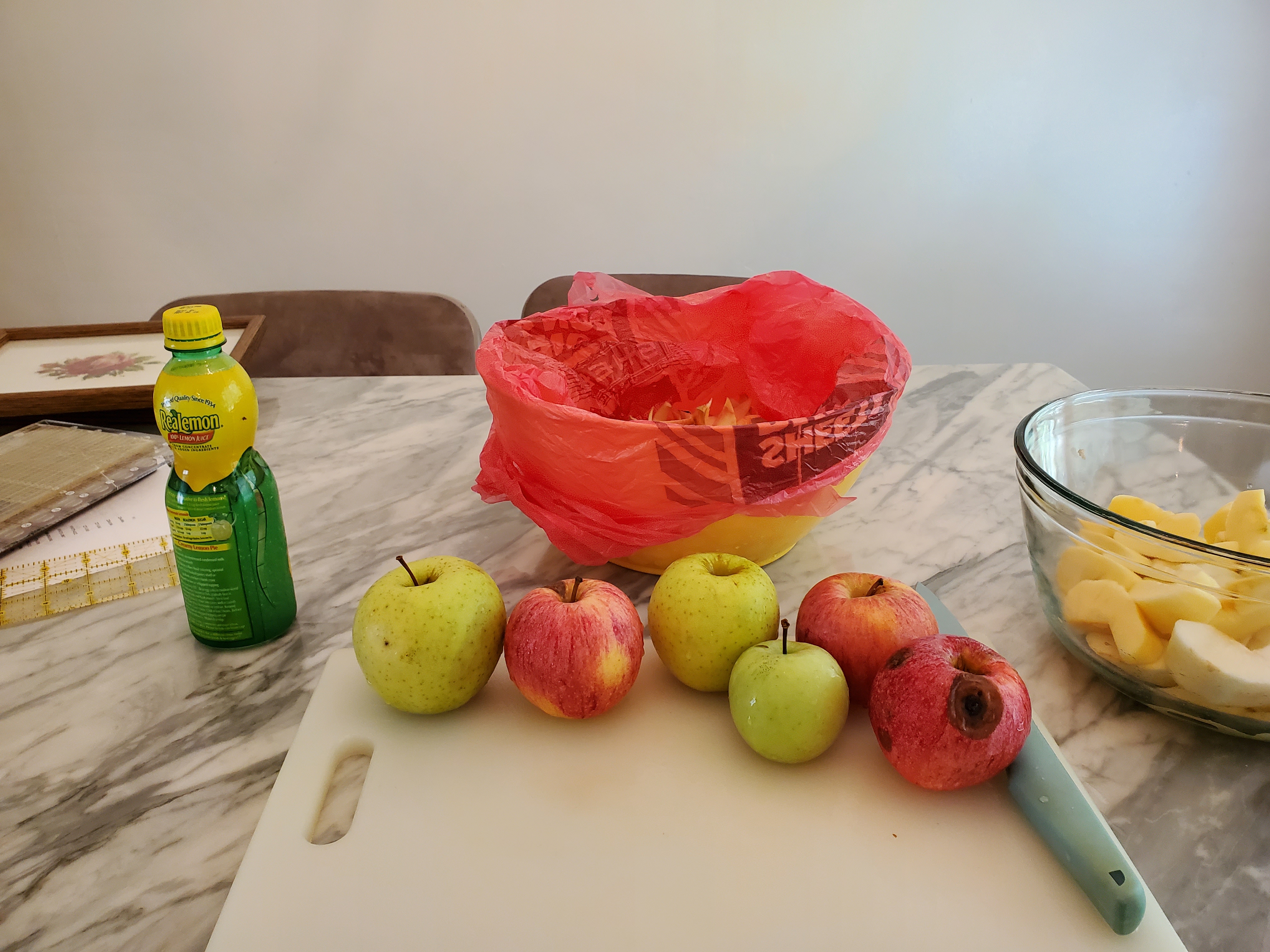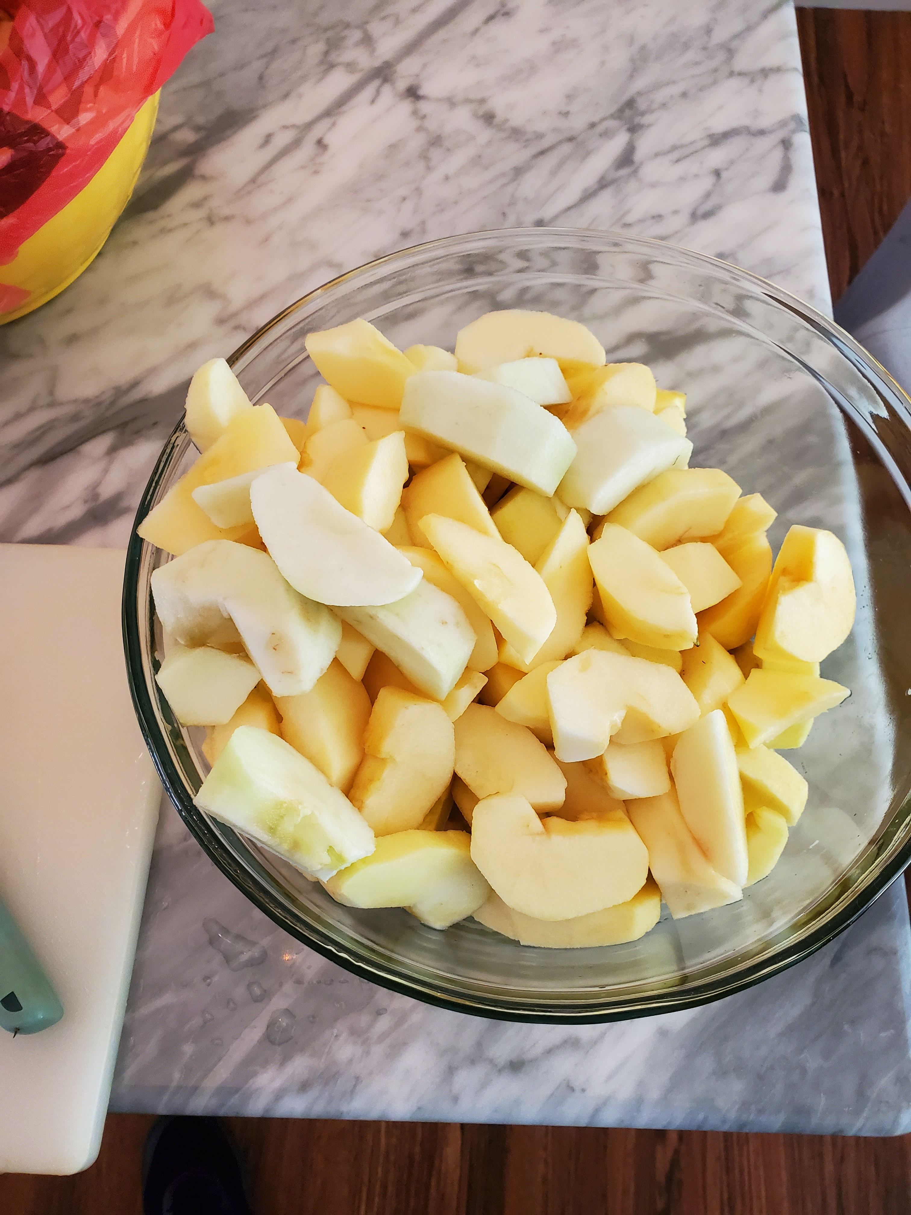As I cut, I put the prepared slices in a bowl. Every few apples, I sprinkle them with a bit of lemon juice and give them a toss. I prep about 14 – 20 apples per batch. The number depends on how long my back lasts.