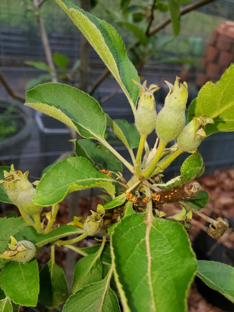 The Golden Grimes (left) has oodles of apples on it already! The Mary Reid (right) has just a few.